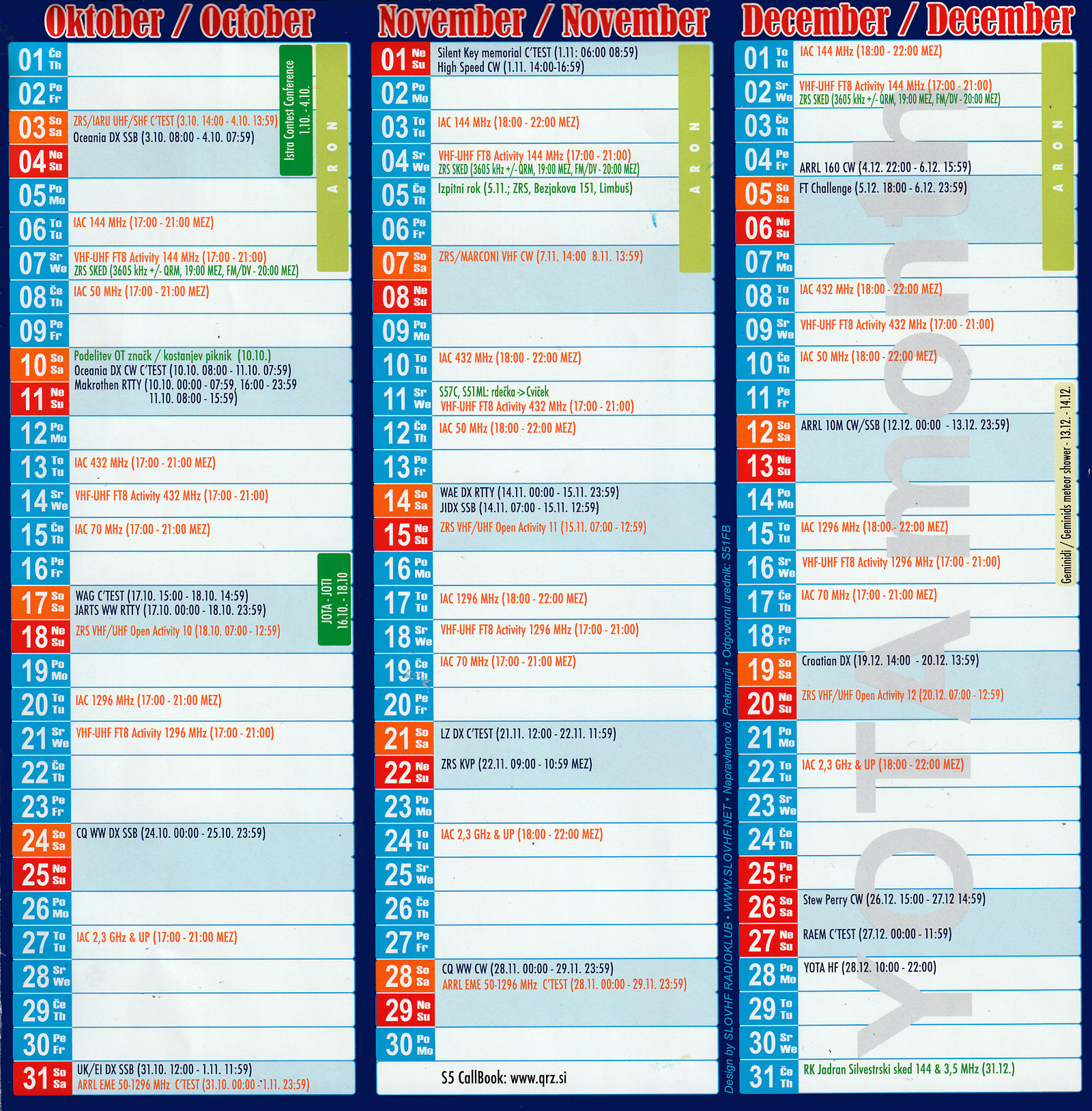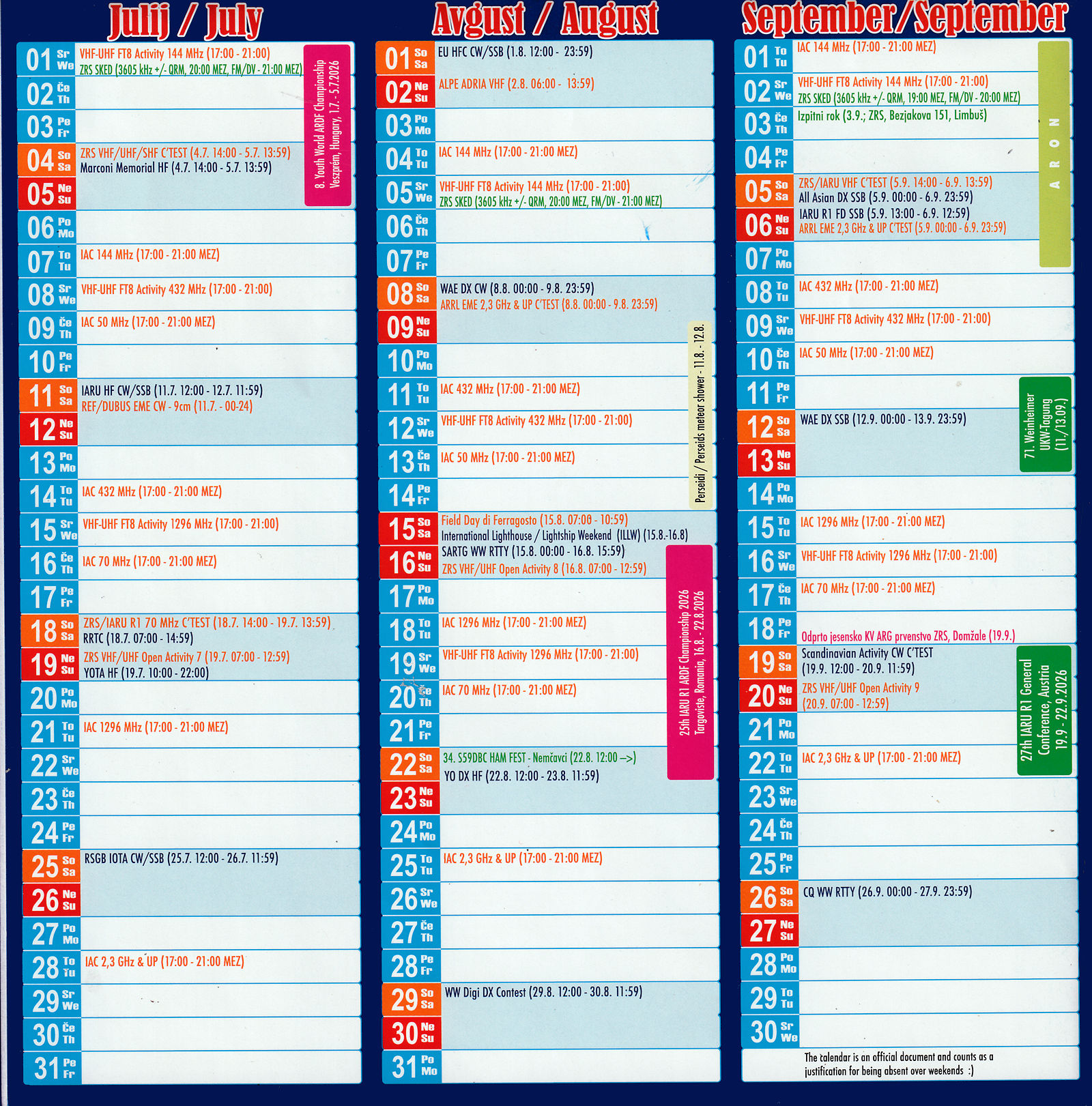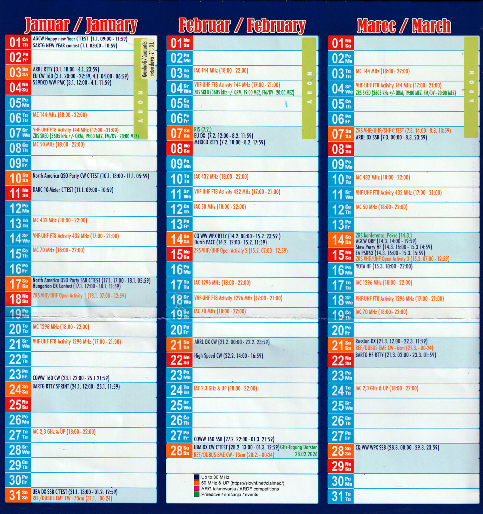 Priložen je koledar vseh pomembnejših in ostalih radioamaterskih dogodkov, tako doma kot v svetu v letu 2026.